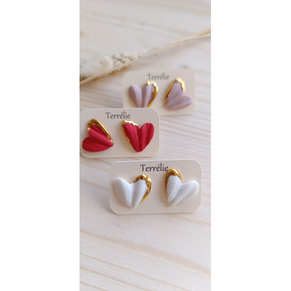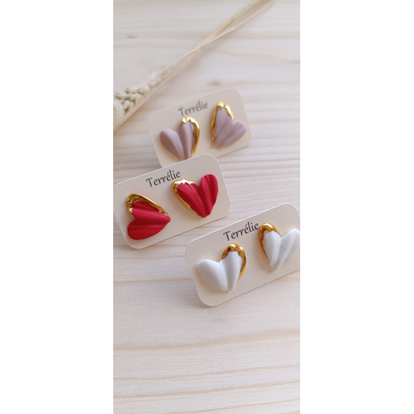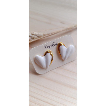 Boucles d'oreilles puces en porcelaine en forme de cœurs et recouvertes d'or.